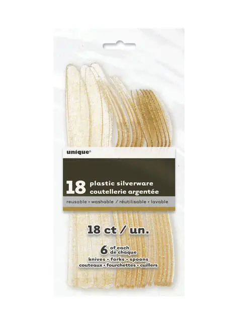 Lieferumfang: 6 Gabeln, 6 Löffel, 6 Messer aus Plastik