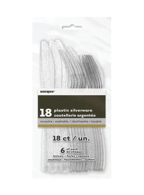 Lieferumfang: 6 Gabeln, 6 Löffel, 6 Messer aus Plastik
