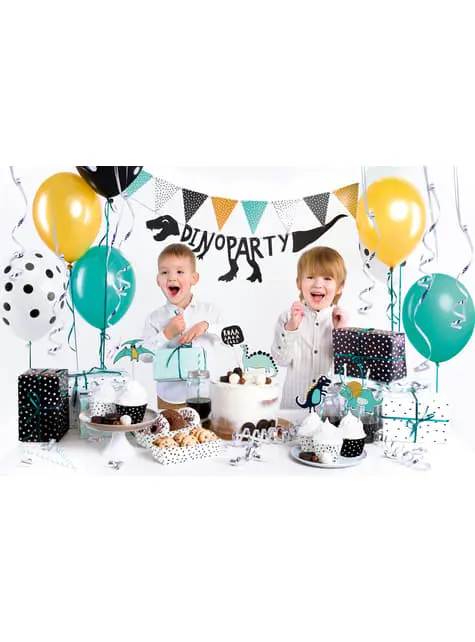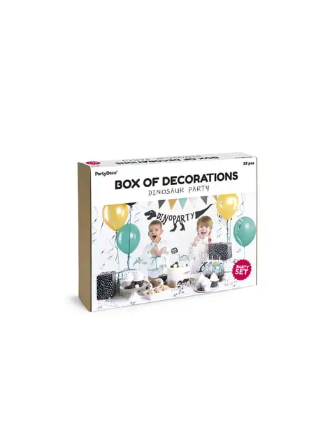 Lieferumfang: 1 Banner, 1 Papiergirlande, 6 Muffinförmchen, 5 Kuchendekorationen, 2 Geschenkschachteln, 10 Strohhalme, 6 silberne Pfeifen, 6 Luftballons, 1 Luftschlange und 1 grünes Satinband.