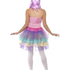 Beinhaltet ein Brustteil aus Latex mit aufgedruckten Süßigkeiten und ein Kleid mit verschiedenen Farben.