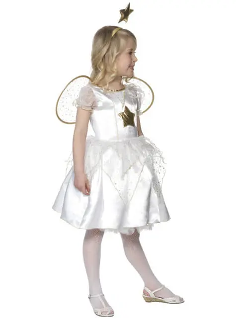 Beinhaltet ein weißes Kleid, Flügel in Weiß und Gold und ein Haarband mit goldenem Stern.